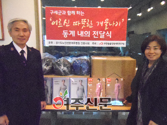 경기도노인전문여주병원(원장 이주석) 간호사회는 지난 14일 작년에 이어 올해에도 여주지역 소외된 저소득 홀몸어르신들에게 따뜻한 겨울을 날 수 있도록 병원자체 바자회에서 마련한 성금 120만원을 구세군여주나눔의집(원장 남세광)에 전달했다.