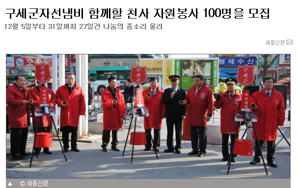 [나눔의집] 구세군자선냄비 함께할 천사 자원봉사 100명을 모집(2013.11.12 세종신문)