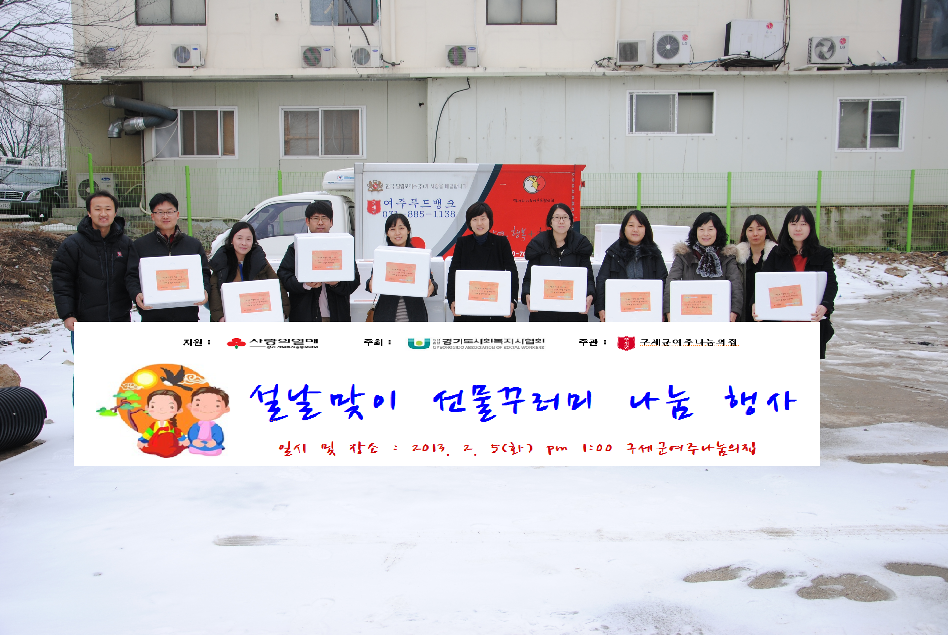 이에 구세군여주나눔의집은 여주 관내 저소득위기가구의 발굴과 지역사회서비스를 연계하고 있는 무한돌봄강남네트워크팀을 중심으로 지난 2월 5일 여주관내에서 무한돌봄사업의 파트너십으로 지역복지를 실천하고 있는 협력기관 10개소(여주군건강가정지원센터, 여주군노인복지관, 여주군다문화지원센터, 여주군드림스타트센터, 여주군무한돌봄 센터, 무한돌봄강북네트워크팀, 여주군방문보건센터, 여주군장애인복지관, 여주군정신보건센터, 신륵노인복지센터)와 함께 간소한 설날물품 전달식을 갖고 협력기관 이용대상자 중 저소득노인, 한부모가구를 포함한 재가서비스 대상자 150가구에게 600만원 상당의 설명절 선물꾸러미 물품을 전달하였다.