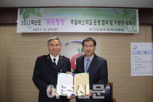 경기도여주교육지원청(교육장 곽수영)은 2011학년도 방과후학교 주말버스학교 운영의 효율성을 높이기 위하여 구세군여주지역아동센터에 프로그램을 위탁하는 협약식을 지난 3월 25일 가졌다. 이날 협약식에는 오학초등학교 황대섭 교장을 비롯하여 5명의 교사가 참석하였으며, 이들에 대해 지원단 위촉식도 함께 진행하였다.