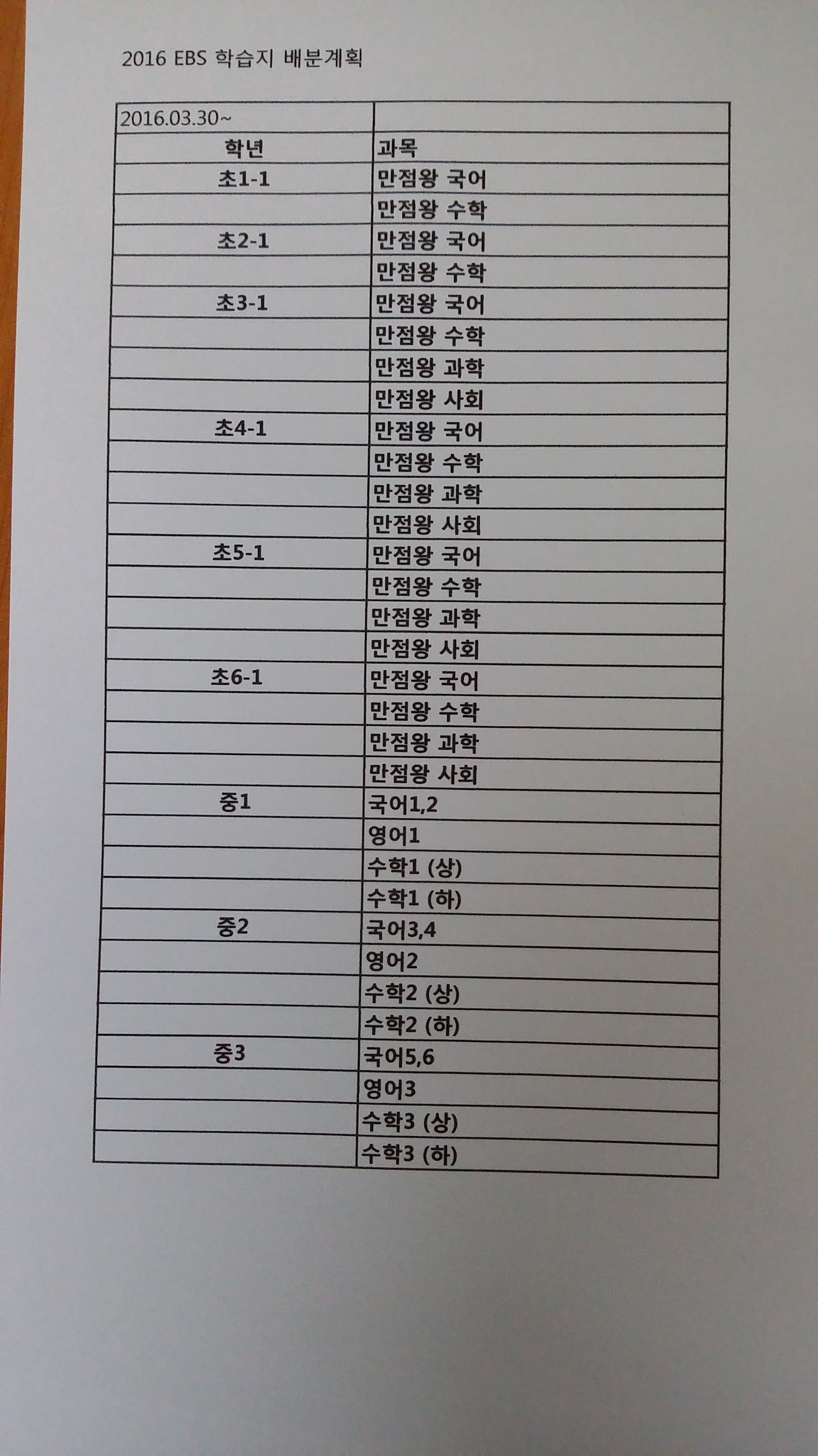 2016년도 1학기 EBS학습지를 배분합니다.