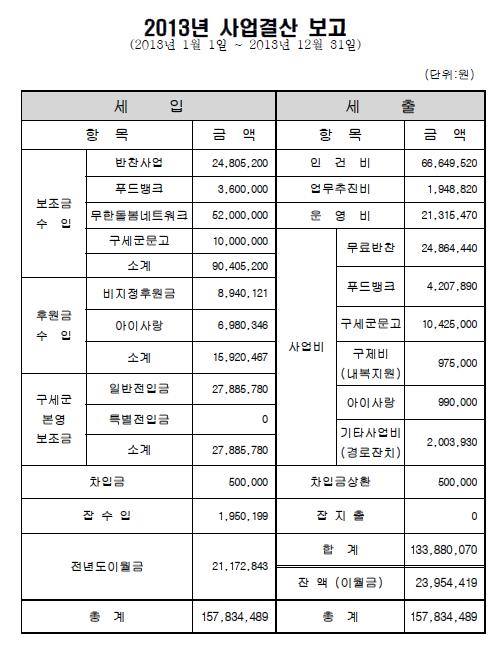 2013.01.01~2013.12.31 사업결산ㆍ후원금사용내역 보고입니다.